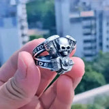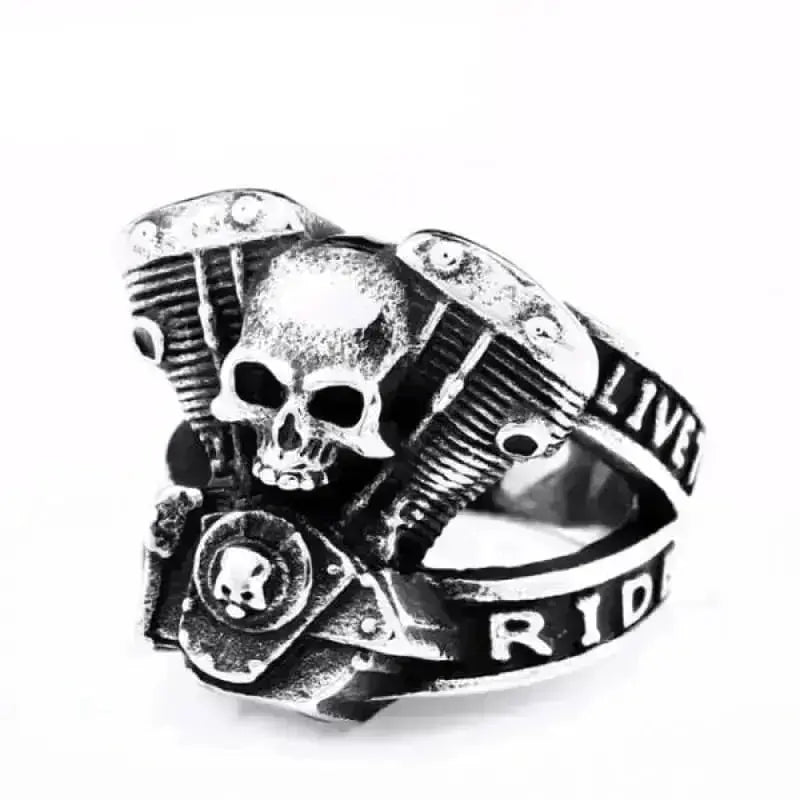 Êtes-vous un biker véritable, vivant selon la maxime "Live to ride, ride to live" ? Alors, laissez le monde savoir que vous adhérez à cette philosophie avec fierté en portant la bague "Live to Ride". Cette magnifique pièce de métal incarne l'esprit des motards, avec son design original représentant un moteur de moto orné d'un crâne, ajoutant une touche résolument badass à votre look. Si vous cherchez à exprimer pleinement votre passion pour la moto et l'esprit biker, cette bague est faite pour vous. Osez la porter.
