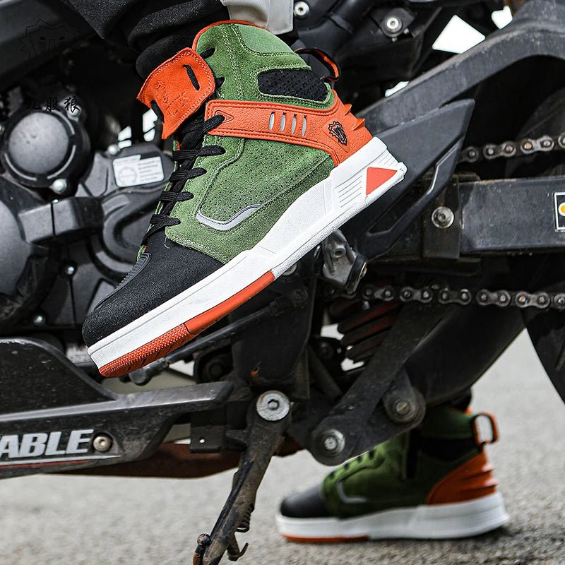 Présentées en différentes combinaisons de couleurs attrayantes : noir/vert, noir/rouge, noir/bleu, noir/gris, nos Baskets Moto montante n'ont rien à envier aux baskets standards en matière de style.