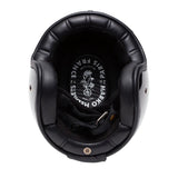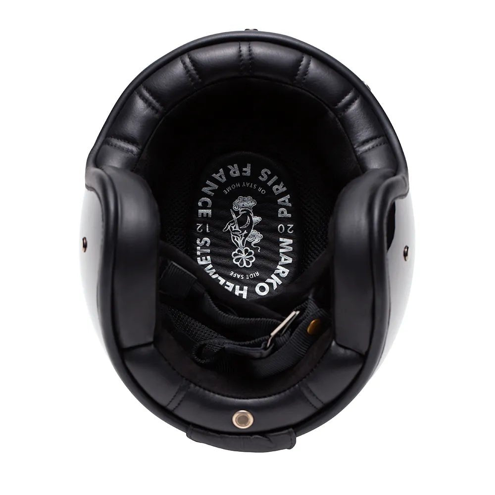 Ce casque jet noir est une véritable signature du style vintage sobre et élégant. Son noir profond métallisé, en parfaite harmonie avec son intérieur en cuir noir, en fait une pièce discrète mais raffinée.