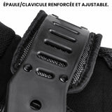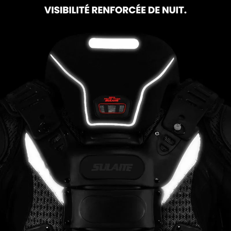 - Protection intégrale : épaules, coudes, torse, dos, nuque