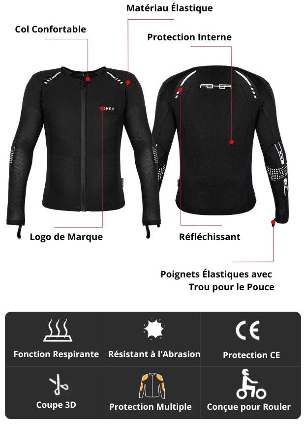 - Protection renforcée : Plaques de protection homologué intégrées pour protéger vos épaules, coudes et dos en cas de chute.