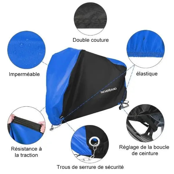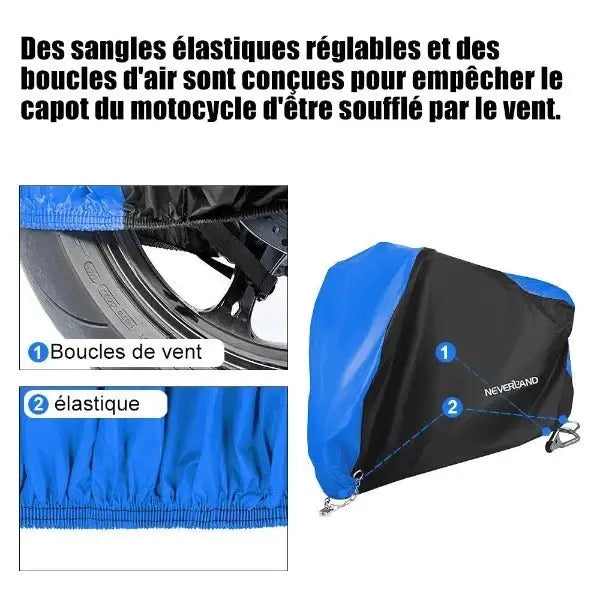 La housse possède 4 œillets en bas afin de pouvoir passer facilement votre cadenas dans la roue intérieur. facilitant l'utilisation du verrouillage de la moto