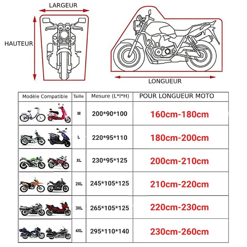 - Convient à toutes sortes de motos: Cette housse est adaptée à tous types de motos, que ce soit des motos de route, des motos de tout terrain ou même des vélos électriques.