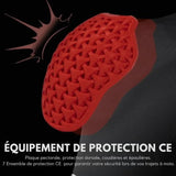 Dotée de sept protections intégrées, cette veste protège les zones critiques : dos, épaules, coudes, et poitrine. Conçue avec des matériaux répondant aux normes CE, elle offre une résistance optimale aux impacts et éraflures.