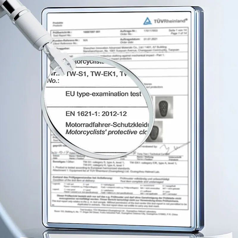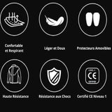- Inclus 7 pièces de protections CE certifiées CE2 et ESA : 2 coussinets pour la poitrine, 1 pour le dos, 2 pour les épaules et 2 pour les coudes.