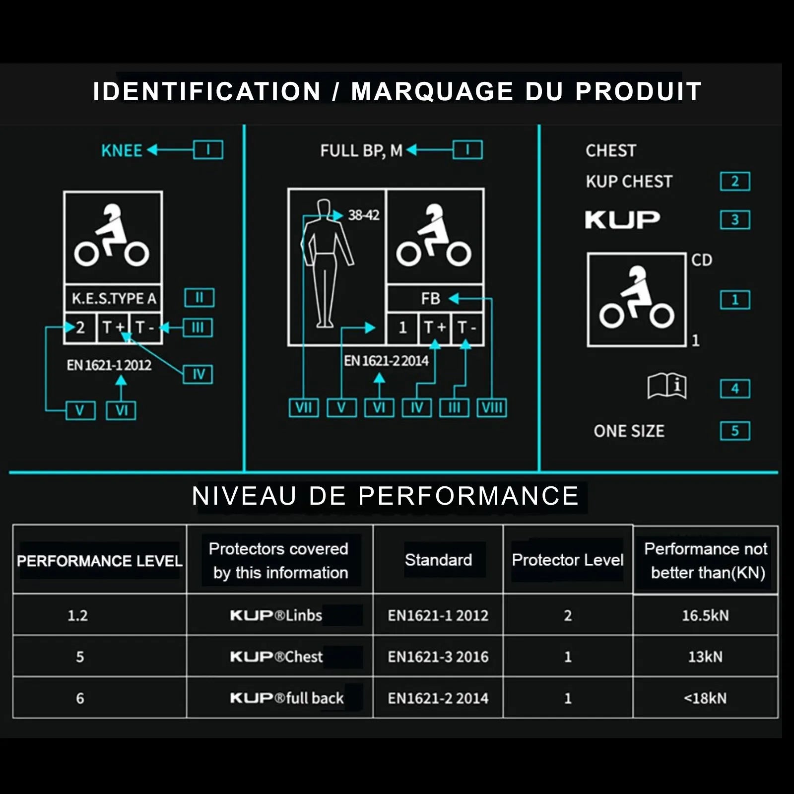 - Inclus 7 pièces de protections amovibles CE certifiées CE2 et CE1 : 1 pour le dos, 2 pour les épaules 2 pour les coudes et 2 pour la poitrine.