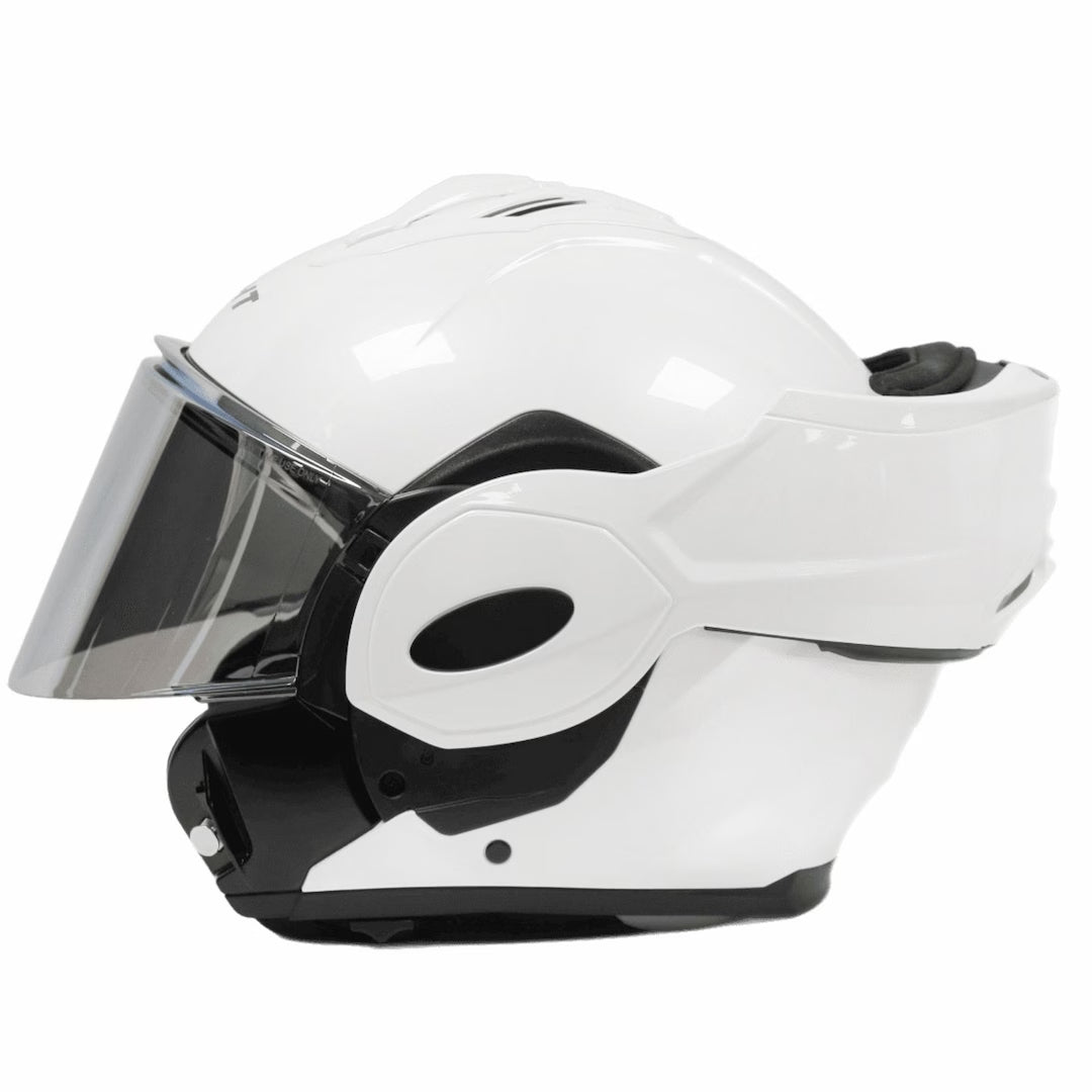 Le FlipTech EIGHT blanc brillant incarne la polyvalence à l'état pur. En quelques secondes, il passe de la protection complète d'un intégral à la liberté d'un jet, sans outil ni manipulation compliquée. La mentonnière pivotante à 180° et son verrouillage sécurisé rendent l'opération aussi naturelle qu'un simple geste.