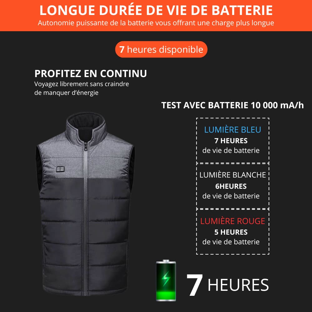 - Batterie Longue Durée : Jusqu'à 12 heures de chaleur continue. Le gilet utilise une batterie rechargeable de 10,000 mAh pour une longue durée d'utilisation.